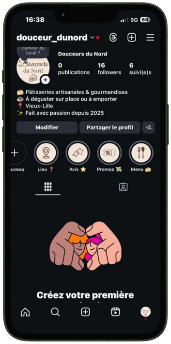 Création d’une identité visuelle complète pour un compte sans publications : logo, bio, noms et icônes de stories.